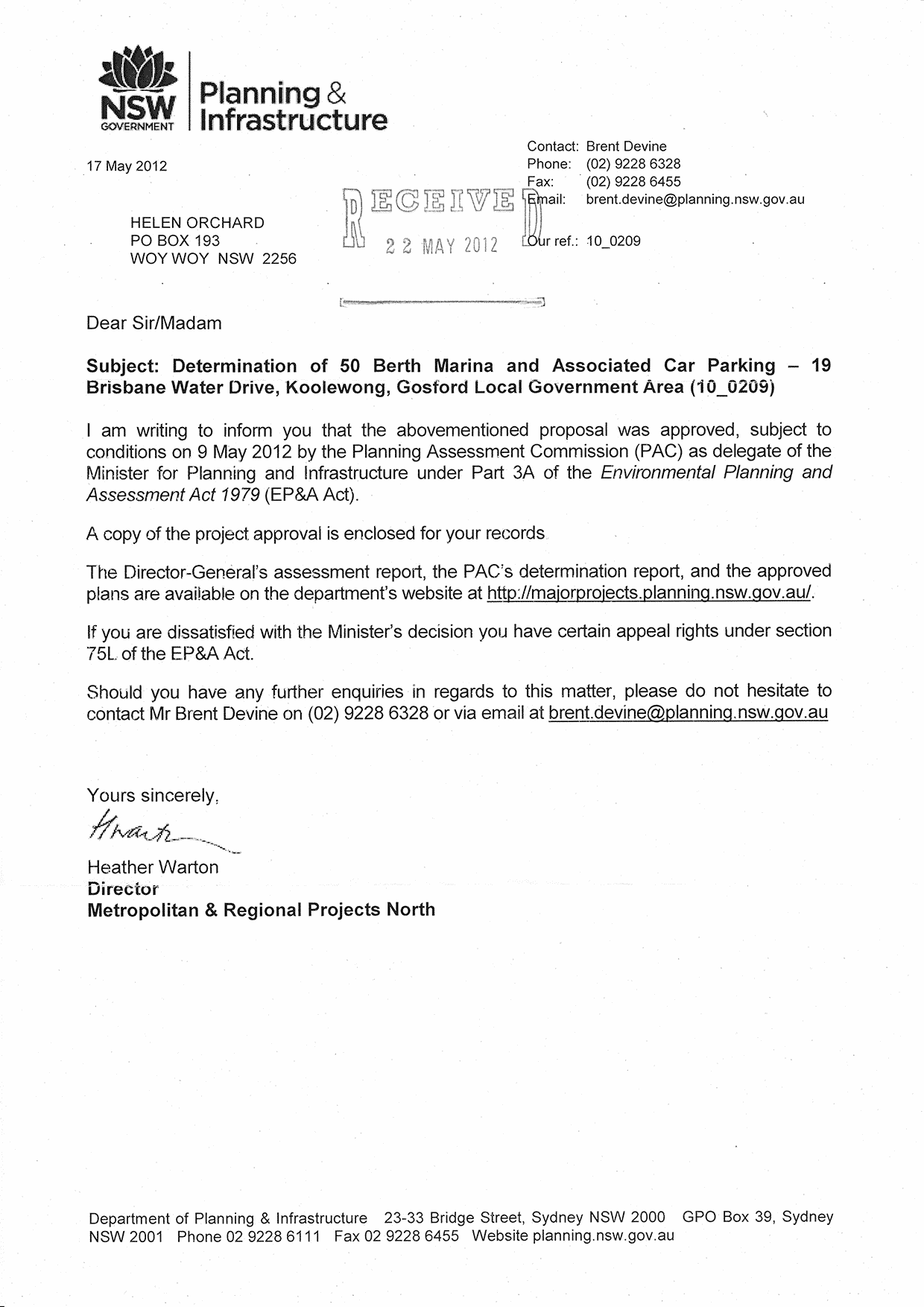 We have received correspondence advising that the proposed 50 berth marina at Brisbane Water Drive, Koolewong has been approved, subject to conditions laid down by the Planning Assessment Commission.